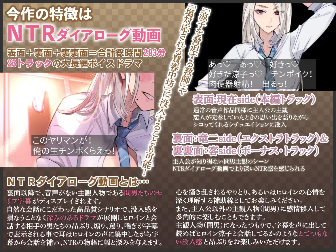 いつものように、貴方は涼子さんの浮気話を聞かされています。するとふと話題が涼子さんの過去に。不良グループのリーダーのオンナだったこと、地元を離れるための資金を稼ごうと売春をしていたこと、そして人生の転機となった素敵なおじさま・伊達さんと出会ったこと。聞きたい、だけど聞きたくない。そんな貴方の思いを理解してくれている涼子さんは、その時のえっちの様子を再現しながら、優しく貴方を鬱勃起に導いてくれます。