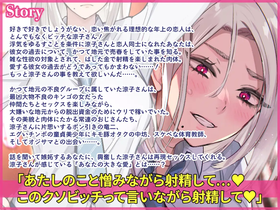 好きで好きでしょうがない、恋い焦がれる理想的な年上の恋人は、とんでもなくビッチな涼子さん!浮気をゆるすことを条件に涼子さんと恋人同士になれたあなたは、彼女の過去について、かつて地元で売春をしていた事を知る。雑な性欲の対象とされて、はした金で射精を楽しまれた肉体。愛する彼女の過去がどうであってもかまわない…!もっと涼子さんの事を教えて欲しいんだ…!