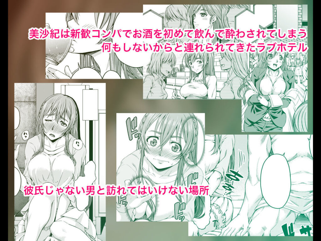 高校卒業を機に付き合い始めた美沙紀ちゃんと亮祐。だけど、なかなかキス以上の関係に進めません。大学の新歓コンパに参加した美沙紀ちゃんですが、調子に乗って酔いつぶれてしまいます。サークルの代表・岸本の口車に乗ってラブホに連れ込まれてしまった美沙紀ちゃんは、無理やり犯され処女を奪われてしまいます。恥ずかしい姿を撮られてしまった美沙紀ちゃんは、嫌々ながらも岸本の言われるままに。
