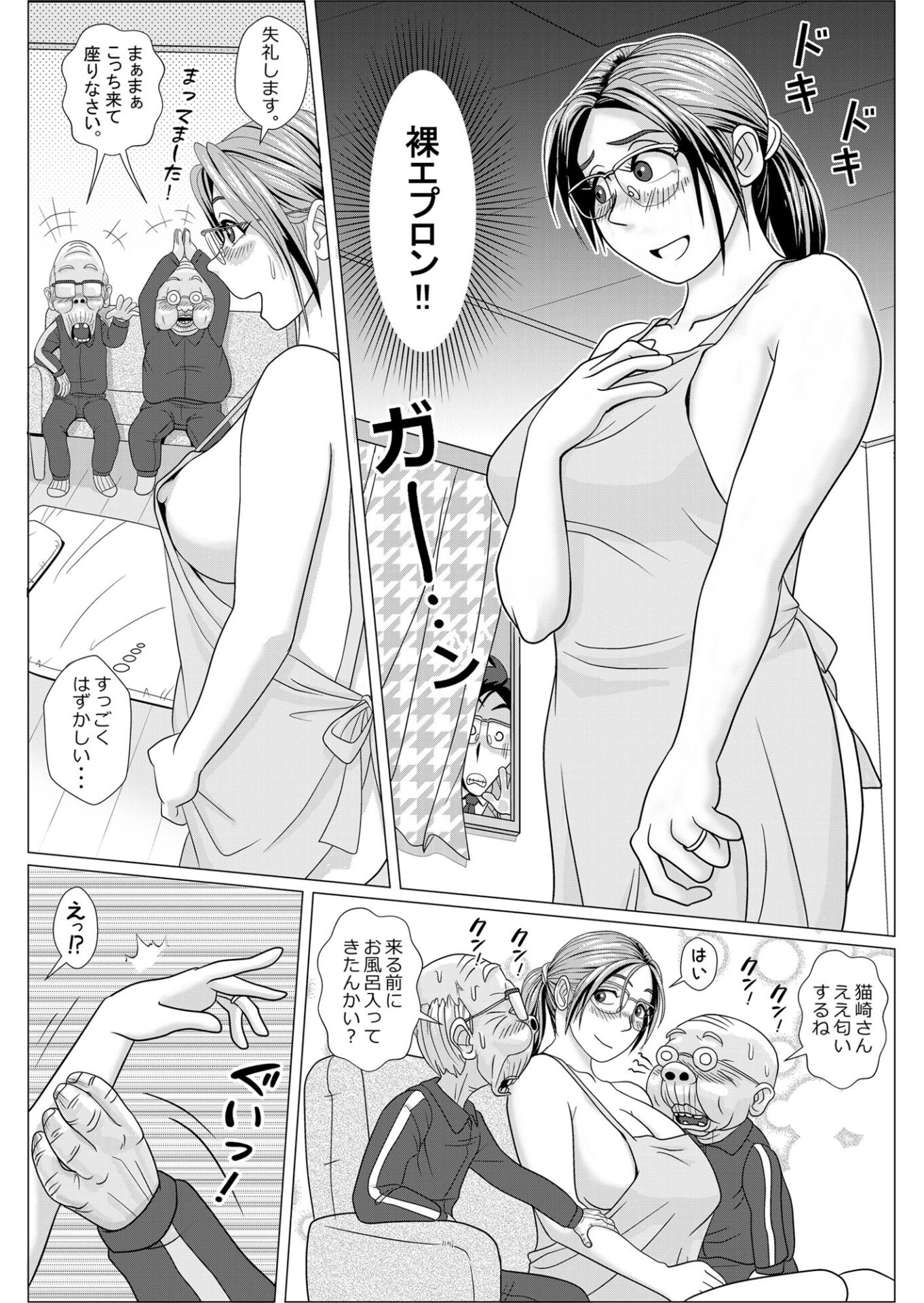 自分の妻が二人の老人を相手に裸エプロンを着けてみだらな行為をしていた。