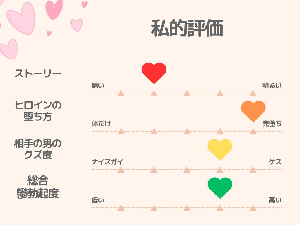 チャラ男から、自分は社長の息子で夫の処遇を決められる立場にあることを聞かされたなつみさんは、夫を守るためカラダを許してしまいます。嫌悪する男に抱かれるたびに性感を開発されていくなつみさん。夫とのセックスでは満足できないカラダに調教されてしまいます。チャラ男のちんぽを嬉しそうにしゃぶるようになってしまったなつみさんの姿は激シコ。男に支配される悦びを教え込まれていく過程が、なつみさんのモノローグで丁寧に描かれています。